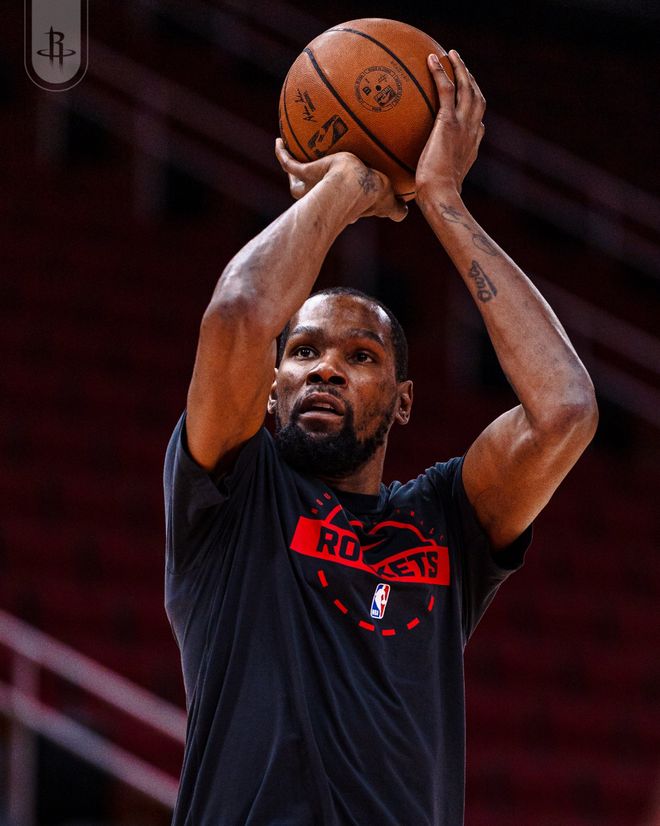 火箭队首发阵容:汤普森、伊森、杜兰特、史密斯、申京
