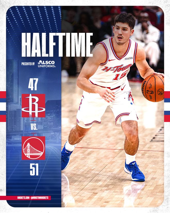 谢泼德和伊森联手6分开始第二节,火箭队只落后4分。勇士队外线再次开火,霍福德和波杰姆斯基各中三分再次拉开。双方拉锯几个回合,桑托斯连取4分,半场前4分钟时勇士队以45-35再次领先10分。奥科吉又挺身而出命中三分,杜兰特也锦上添花,他们联手率队打出10-0的反击波,火箭队追平比分。47平后桑托斯连进两球,半场结束时勇士队以51-47领先4分。
